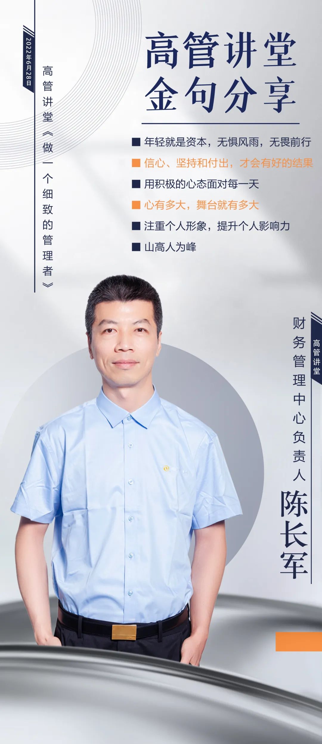 本期内容是一堂关于管理的分享课,讲师以自身出发,从管理者的行为准则、精细化管理、个人心得分享以及在路上四个方面展开讲解。