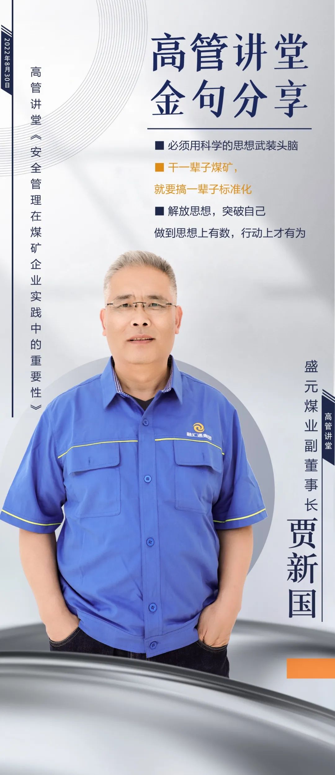 8月底,企业文化高管讲堂04期开课,盛元煤业副董事长贾新国受邀为本期课堂讲师,煤业队长及以上人员、各子公司及职能中心负责人参加了本期课堂。