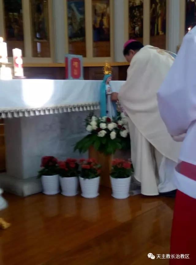 早上六点,全体教友齐聚教堂参与 敬礼法蒂玛圣母显现一百周年仪式,丁主教为圣母献上皇冠(皇冠象征天主之母的崇高地位)、玫瑰念珠(玫瑰经是圣母喜爱的经文,圣母在显现时曾要求我们为罪人悔改、世界和平诵念玫瑰经)并敬挂圣衣(圣衣是奉献自我与圣母无玷圣心的标志,路济亚修女在1950年8月15日曾说:圣母圣衣与玫瑰经是不可分开的),丁主教代表大家为圣母奉献了鲜花,众教友一起诵念【圣母经】,并向圣母献歌【法蒂玛圣母歌】。